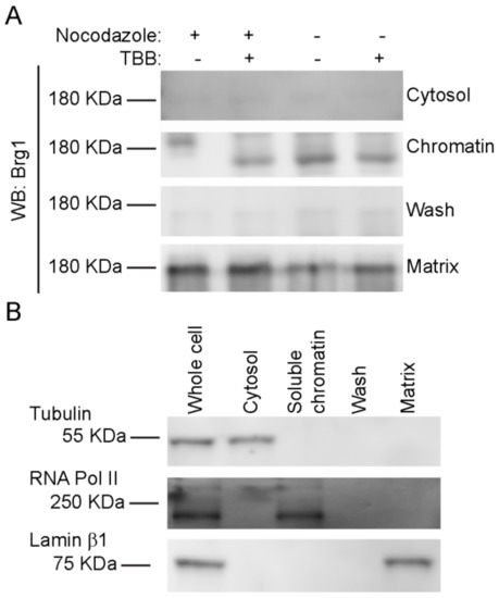 Nuclear fractionation experiments showed that Brg1 and other mSWI/SNF proteins are associated with both soluble chromatin and the nuclear matrix [75,76], which is a nonchromatin fibrogranular ribonucleoprotein network within the nucleus [77]. The nuclear matrix provides an anchoring structure to chromatin loops, among other functions [78,79,80]. We previously demonstrated that Brg1 proteins containing phosphomimetic mutations at sites of CK2 activity lost the ability to associate with both soluble chromatin and the nuclear matrix, whereas Brg1 containing alanine substitutions at sites of CK2 activity that prevented phosphorylation associated only with the nuclear matrix [17]. We investigated the effects of CK2 inhibition on the localization of Brg1 in mitotic cells using a sequential extraction protocol that generates a cytosolic fraction, a soluble chromatin fraction, and, after a high salt wash, the nuclear matrix fraction [17,75,81]. A representative Western Blot of Brg1 from primary myoblasts is shown in Figure 6A. The hyperphosphorylated, or lower mobility, form of Brg1 from mitotic myoblasts was associated with the soluble chromatin fraction. In contrast, Brg1 associated with the nuclear matrix showed no alterations in gel mobility in all the conditions tested (Figure 6A). Representative control Western Blots showed the purity of the fractions (Figure 6B). Tubulin β was found in the cytosolic fraction, lamin β1 localized to the nuclear matrix, and RNA pol II was located in the soluble chromatin. The data indicate that Brg1 phosphorylated by CK2 in mitotic cells is associated exclusively with the soluble chromatin and is not associated with the nuclear matrix.