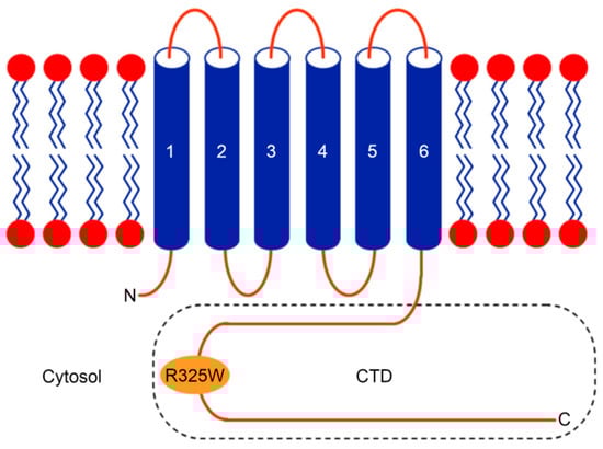 In humans, the human zinc transporter 8 (hZnT8) is implicated in decreasing the cytoplasmic Zn+2 level by exporting Zn+2 ions into insulin-containing secretory vesicles in pancreatic β cells [,]. Notably, hZnT8 is involved in the formation of water-insoluble insulin crystals, ultimately resulting in the storage of the hexameric insulin bound to two Zn+2 ions in pancreatic β cells [,]. Hence, hZnT8 has been regarded as a metal carrier during insulin maturation, storage, and secretion []. It has been shown that a nonsynonymous single nucleotide polymorphism (SNP), termed as rs13266634, in the gene (SLC30A8) encoding hZnT8 introduces a substitution (R325W) in the C-terminal domain (CTD) of hZnT8 (Figure 1), and genome-wide association studies (GWASs) reveal that the substitution R325W in the CTD of hZnT8 increases the risk of developing T2D []. However, the link between the rs13266634 polymorphism and the risk of susceptibility to T2D has not been identified in all of the human studies [,,,,]. Interestingly, it has been shown that loss-of-function mutations in the gene encoding hZnT8 provide protection against the risk of T2D []. Such conflicting study results may be due to racial differences of the selected population, different criteria for sample selection, or alternative assay systems used for detection [].