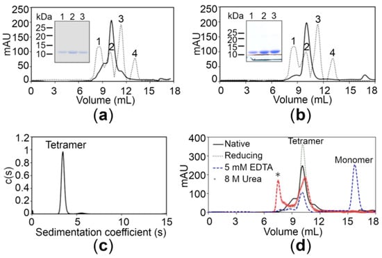 Monodispersity analysis by negative-stain electron microscopy (EM) revealed that both proteins were devoid of any aggregates in solution (Figure S3, Supplementary Materials). In order to determine the oligomeric state, size-exclusion chromatography (SEC) of the wild-type (WT) CTD was performed under native conditions. The chromatogram of the WT CTD showed a major peak with a retention time corresponding to the apparent molecular mass of 40 kDa, suggesting that the protein exists as a tetramer in solution (Figure 2a). The latter findings were also supported by analytical ultracentrifugation using the sedimentation velocity method, revealing a major peak corresponding to the tetrameric form (39.6 kDa) for the WT CTD (Figure 2c). Moreover, the experimental molecular weight (MW) of the proteins was also confirmed using mass spectrometry, revealing that the MW of the WT CTD is 9.828 kDa (Figure S2). The SEC elution profile of the WT CTD under reducing conditions (3 mM beta-mercaptoethanol in 20 mM Tris-Cl, pH 7.5, 150 mM NaCl) was similar to that under native conditions, suggesting that the tetrameric state is not due to disulfide linkages (Figure 2d). Interestingly, the equilibrium shifted from the tetrameric state to the monomeric state in the presence of 5 mM ethylenediaminetetraacetic acid (EDTA) (Figure 2d), indicating that Zn+2 ions play an important role in stabilizing the tetrameric state of the CTD. This tetrameric state is also stable under denaturing conditions (8 M urea), although some aggregates are also formed (Figure 2d). Importantly, the CTD of the disease risk variant also exists in the tetrameric form similar to the WT CTD (Figure 2b), suggesting that the R325W substitution does not affect the oligomeric state of the CTD in solution.