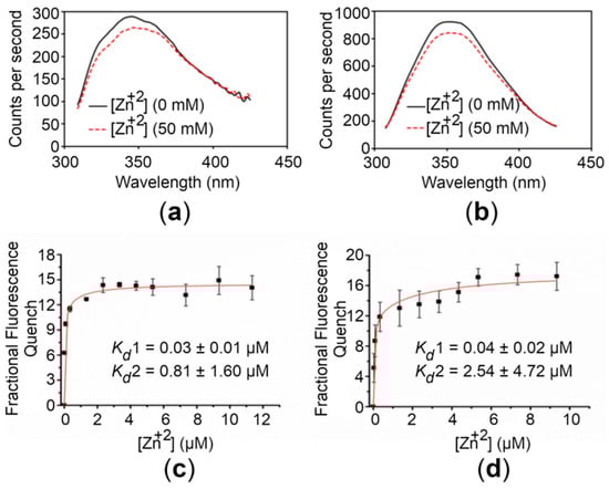 Fluorescence measurements were performed at 25 °C on a scanning fluorimeter (PerkinElmer, Shelton, CT, USA) using 3 mL quartz cuvettes. Excitation and emission slit widths of 2 nm were used. Solutions (2.5 mL) of purified proteins in buffer (20 mM HEPES, pH 7.5, 150 mM NaCl) were serially prepared by adding ZnCl2 to a final concentration of 50 mM. Excitation was done at 285 nm and emission spectra were recorded from 310 nm to 425 nm. The affinity constant (Kd) for Zn+2 was calculated from the background-subtracted spectra by averaging three measurements and using a two-binding-site model to fit the data as follows:
