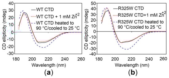 In order to investigate whether the CTDs display similar structural features, circular dichroism (CD) spectroscopy of the proteins was performed. The CD spectrum of the WT CTD, particularly in the region between 200 and 240 nm that reflects the secondary structure propensities in proteins [], is almost identical to the CTD of the disease risk variant (Figure 4). Thus, it appears that the R325W substitution does not induce significant structural changes in the CTD. Moreover, addition of 1 mM Zn+2 to the CTDs did not produce any detectable structural changes in solution, indicating that Zn+2 binding is independent of any alteration in the global structure of the CTDs (Figure 4). Finally, to check the thermal and refolding ability of the CTDs, CD spectra were recorded for the proteins after heating (unfolding) and cooling (refolding). These spectra showed that the domains could not refold after thermal unfolding (Figure 4).