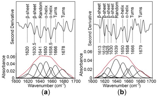 The CTDs (20 µL each; 6 mg/mL in buffer (20 mM HEPES, pH 7.5, 150 mM NaCl)) were dried on a platinum ATR platform (diamond crystal) to form a hydrated film. Spectra from 4000 to 500 cm−1 were acquired on a Bruker FT-IR spectrometer (Billerica, MA, USA) in absorbance mode at 1 nm resolution, 256 scans co-addition and three-term Blackman–Harris apodization. To remove the bending vibration of H2O that gives an absorption band at around 1645 cm−1 in the amide I region, spectra for the buffer were recorded, and subtraction of residual vapor absorption was performed. Final manipulated spectra of both domains were obtained between 2000 cm−1 and 1770 cm−1. For secondary structure analysis, the second derivative of spectra corresponding to the amide I region (1700–1600 cm−1) was obtained using Origin software version 7.0 (Origin Lab Corporation, Northampton, MA, USA) following the Savitzky–Golay method []. Decomposition of each spectrum into individual bands in the amide I region was performed by nonlinear peak fitting using Galactic PeakSolve™ software (version 1.05, Galactic Industries Corporation, Salem, NH, USA). Band assignments for the interpretation of spectra were done on the basis of previous measurements [].