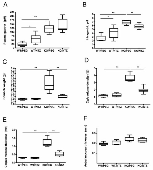 2.1. KO Mice Had Elevated Intragastric pH and Plasma Gastrin