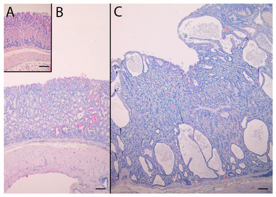 After measuring intragastric pH, the stomach was removed, rinsed in saline, weighed, opened along the greater curvature and inspected macroscopically. Tissue samples for histopathology were taken longitudinally from the rumen to the pylorus on the major curvature and fixed in 4% formaldehyde before processing and paraffin embedding. Sections (4 μm) were cut and stained with hematoxylin and eosin (HE) and examined microscopically. Dysplasia was graded as none, mild, moderate or severe, and inflammation was graded according to the Updated Sydney Classification [66]. To assess trophic changes, mucosal thickness was determined using an ocular grid. Measurements were performed in areas without macroscopic abnormalities and where gastric crypts were visible in their full length. Corpus and antral mucosal thickness were measured at five locations in each animal and the means recorded. The number of cystic dilations and invasions through the muscularis mucosa per mm horizontal mucosa was counted in areas where the gastric glands were cut longitudinally and visible in their whole length.