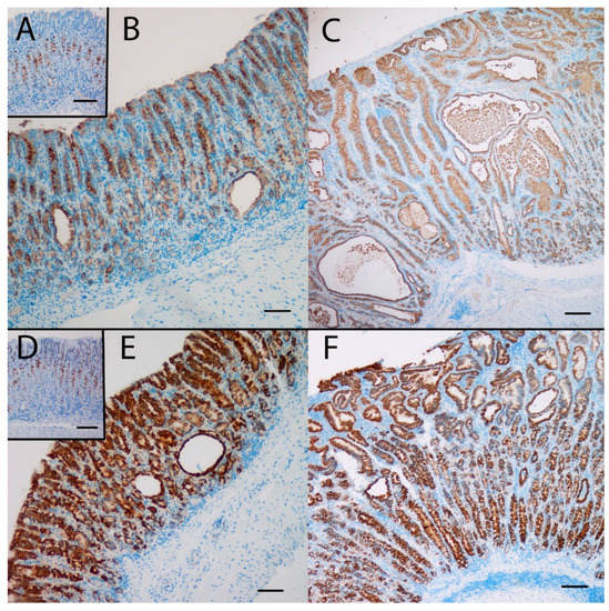 - Nomura, S.; Yamaguchi, H.; Ogawa, M.; Wang, T.C.; Lee, J.R.; Goldenring, J.R. Alterations in gastric mucosal lineages induced by acute oxyntic atrophy in wild-type and gastrin-deficient mice. Am. J. Physiol. Gastrointest. Liver Physiol. 2005, 288, G362–G375. [Google Scholar] [CrossRef]