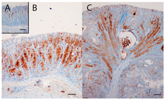 The term SPEM is viewed by many as synonymous with the older terms “pyloric metaplasia”, “pseudopyloric metaplasia” or “antralization” and the actual alterations may be considered a common response to glandular injury observed in both mice and humans. Furthermore, ulcer-associated cell linage (UACL) has also been viewed as similar reparative linages and is observed in reparative processes along the gastrointestinal tract, including at the edges of gastric ulcers [56] and also in inflammatory bowel disease [57,58]. Also, one of the highly expressed markers of gastric SPEM, clusterin, seems to have subtle protective roles on oxyntic mucosa [59]. These observations combined suggest that SPEM should not be considered merely a preneoplastic lesion. Accordingly, it has been argued that SPEM could be an phenomenon associated with carcinogenesis, as a form of mucosal injury, not a precursor of cancer [60], and that SPEM and IM could be commensals for a neoplastic process rather than true direct precursors [43]. Reported findings from animal models of IM and SPEM have led to conflicting hypotheses of the cellular origin of the lesions, which may be either chief cells [61] or isthmus stem cells [55]. It is notable that the ability of gastric metaplasia to progress to invasive cancer seems to be lacking in the more than 20 mouse models utilized to study this, which also questions the validity of studies aiming to examine premalignant changes [16]. We propose that further studies of dysplasia and SPEM in patients with chronic atrophic gastritis treated long-term with NTZ [33,35] could provide more information about the roles of SPEM and hypergastrinemia in human carcinogenesis.