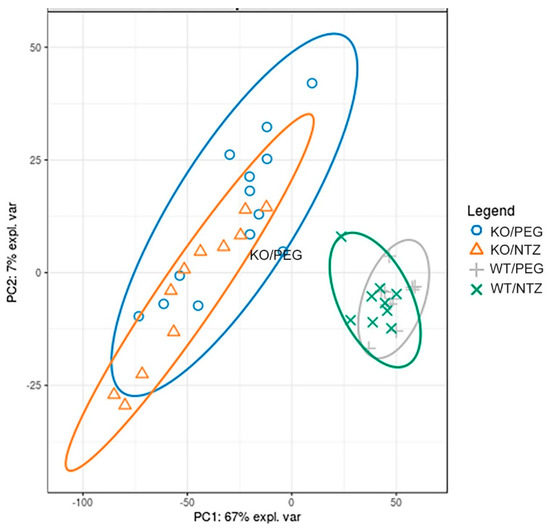 Global gene expression analysis of KO and WT mice given NTZ or PEG illustrated by at principal component analysis plot. Genotype affects global gene expression more than NTZ.
