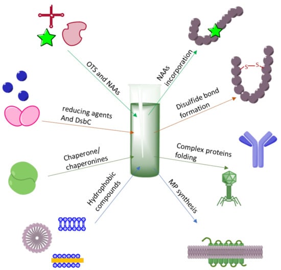 The CF protein synthesis system has several advantages over current in vivo processes. Firstly, since there is no need to support cellular metabolism; all of the cellular resources can be efficiently directed toward the production of a single protein [5]. Although the coupled (i.e., combining both transcription and translation processes) CF system has been proven to be more efficient than the uncoupled one [6], it is still possible to use mRNA or PCR fragments as the matrices escaping genetic engineering and cloning procedures [7]. Taken together, this makes CF technology a reliable and fast way to obtain a high yield of the desired protein. Secondly, the reaction environment can be directly controlled and easily manipulated, since there is no cell barrier. This open nature of the CF system promotes the synthesis of peptides and proteins, whose intracellular expression is problematic, by supplying a CF reaction mixture with the required additives. These additives include chaperones and reducing agents, stabilizing mRNA or promoting complex protein folding, hydrophobic compounds required for soluble expression of membrane proteins (MPs), rare tRNA molecular species for codon usage bias compensation, and orthogonal aminoacyl-tRNA synthetase (aaRS)/tRNA pairs (orthogonal translation system, OTS) for site-specific non-canonical amino acids (NAAs) incorporation in response to unique codon (Figure 1). These additives are often not applicable for in vivo protein expression due to their inability to cross the cellular membrane or due to their toxic effect on cellular metabolism. Finally, the overexpression of some proteins, including integral membrane proteins (MPs) or incorrectly folded proteins forming aggregates, negatively effects cell fitness and viability. There is also a group of toxic genes that destroy cellular membrane integrity or disrupt the synthesis of nucleic acids, proteins, or cell wall of bacterial host organisms. In this instance, the in vitro approach is a salvation for the synthesis of moderately or highly toxic peptides or proteins.