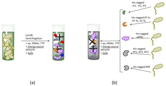 Schema of different types of CF system preparation. (a) The extract-based CF system is obtained from the clarified E. coli cells lysate supplemented by some other compounds and components of transcription/translation processes, including T7 polymerase (T7P), energy regeneration source, and salts. (b) The PURE CF methodology utilizes His-tagged E. coli enzymes transcription/translation factors of high purity (initiation IF, elongations EF, and release RF factors, ribosomal-regeneration factor (RRF), all type of aminoacyl-tRNA synthetases, aaRS, and other), preliminarily expressed and isolated from the heterologous host.