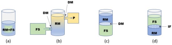 Schematic representation of the different formats of CF synthesis methodology. (a) The batch format utilizes one vesicle comprising both reaction medium (RM) and feeding solution (FS). (b) Continuous-flow CF methodology: FS is permanently pumped in RM through the dialysis membrane (DM); the newly synthesized proteins or by-products are removed from the RM by passing through the DM with other cut-off pores, allowing for target protein collection. (c) Continuous-exchange CF is based on dialysis through the membrane, allowing for the constant substrate addition and by-product removal from the RM. (d) Bilayer format: RM and FD represent two different liquid phases; the exchange and prolonged protein synthesis occur at the phase border or interphase (IF).