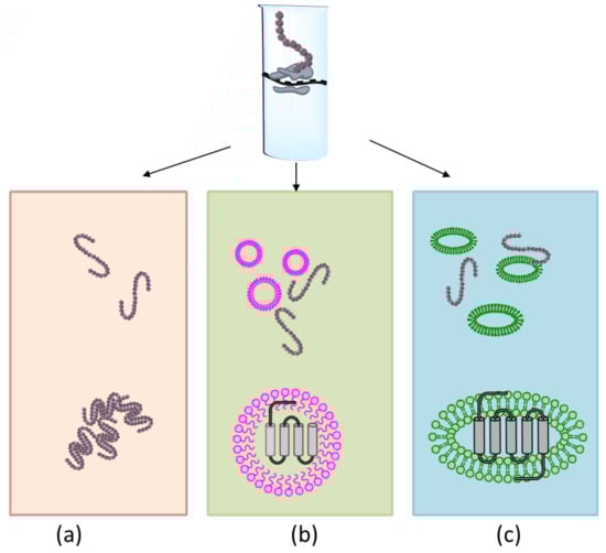 Integral MPs play an essential role in living cells; they participate in signal transduction, cellular and energetic metabolism, transport processes, and many other vital functions, making them one of the most promising targets of modern drug delivery [59]. However, the properties of MPs make them one of the most difficult proteins to produce using cellular expression, which, in turn, prohibits proper investigation of their structure and function. The synthesis of recombinant MPs in diverse host organisms is often accompanied by incorrect folding and aggregation due to the hydrophobic nature of MPs. Proper integration of recombinant MPs requires correct targeting and translocation into membranes, which is not always possible in heterologous host cells. The overexpression of MPs has a toxic effect due to the disintegration of host cell membranes or disruption of cellular signaling or transport function [60]. In this context, the open nature of CF systems allows to escape cytotoxicity and manipulate the reaction medium, thus solving most of the MPs synthesis problem. The synthesis of MPs as a precipitate or as soluble proteins in CF systems can be performed in the absence or presence of detergents/lipids, respectively (Figure 4).