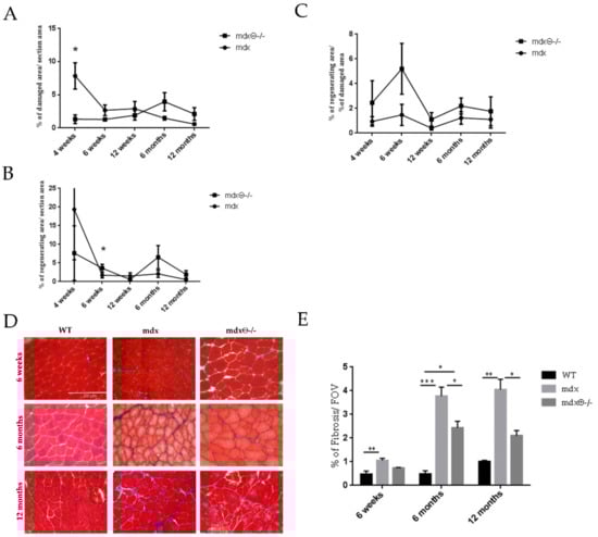 (A) Muscle degeneration level evaluated in mdx or mdx/θ−/− mice at the indicated ages, quantified as the percentage of damaged area over the total area in H&E stained TA cryosections. (B) Muscle regeneration as in A, quantified as the percentage of eMHC positive area over total area of TA cryosections. (C) Ratio of regenerating area over damaged area determined in mdx and mdx/θ−/− mice at each age evaluated. The results are mean ± SEM (n = 4–5/age/genotype); * p < 0.05 two-tailed Student’s t-test). (D) Representative images of Masson’s trichrome staining of cryosections derived from WT/bl10, mdx and mdxθ−/− TA muscle at 6 weeks, 6 and 12 months (bar = 200 µm). (E) Fibrosis was quantified as the percentage of Masson’s trichrome positive area per field of view in TA section. Statistical significance was determined by a one-way ANOVA using a Tukey’s post-test (* p < 0.05, ** p < 0.01, *** p < 0.001 means ± SD).
