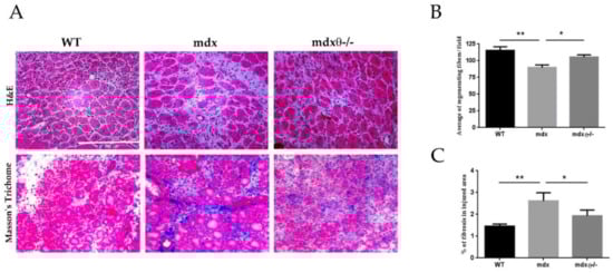 (A) Representative image of TA stained with H&E (upper panels) and Masson’s trichrome staining (lower panels) of 6- month-old WT/bl10 (n = 3), mdx and mdxθ−/− mice (n = 5/genotype), as indicated, at day 7 after CTX injury (bar = 200µm). (B) Average of number of regenerating fibers and (C) Quantification of collagen deposition per field of view. Statistical significance was determined by a one-way ANOVA using a Tukey’s post-test (* p < 0.05, ** p < 0.01, means ± SD).