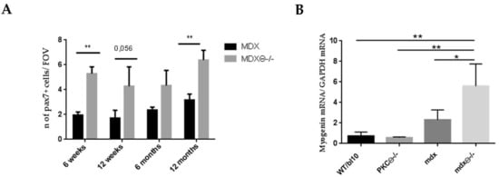 (A) Number of Pax7+ cells in TA section of mdx and mdxθ−/− mice at 6 and 12 weeks, and 6 and 12 months of age. The number of Pax7+ cells was calculated by counting the number of PAX7+ cells per field of view in immune-stained sections. The results are the means ± SD (n = 3/ genotype/ age (* p < 0.05, ** p < 0.01, two-tailed Student’s t-test). (B) Myogenin mRNA levels in WT (n = 2), PKCθ−/− (n = 3), mdx (n = 5) and mdxθ−/− (n = 4) TA muscle from 12 months old mice. The values were normalized vs. GAPDH mRNA level of expression. Statistical significance was determined by a one-way ANOVA using a Tukey’s post-test (* p < 0.05, means ± SD).