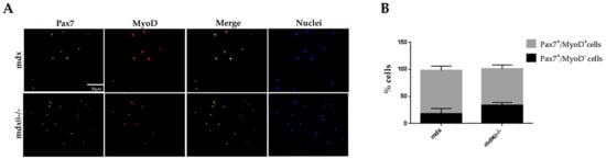 (A) Representative image of Pax7 (green) and MyoD (red) immunofluorescence of SCs, isolated from mdx and mdxθ−/− muscle and cultured for 62 h. Nuclei were counterstained with Hoechst (blue) (bar = 50 µm). (B) Percentages of Pax7+/MyoD− and Pax7+/MyoD+ cells over the total number of nuclei. The results are mean ±S D) (n = 3/genotype).
