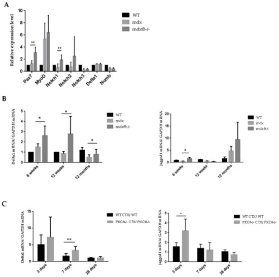 (A) Sorted SCs were analyzed for the level of expression of Pax7, MyoD, Notch receptors, Delta1, and Numb by qRT-PCR. RNA expression level in mdx and mdxθ−/− SCs was normalized against GAPDH. Samples represent three pooled RNA from SCs sorted from three mice for each sample. (* p < 0.05, ** p < 0.01, two-tailed Student’s t-test). (B) Delta1 and Jagged1 mRNA level in mdx and mdxθ−/− TA (n = 4–7/genotype/age). (* p < 0.05, two-tailed Student’s t-test). (C) Ratio of Delta1 and Jagged1 mRNA level between injured and contralateral uninjured TA muscle in WT/bl6 and PKCθ−/− at 3, 7 and 28 days after CTX injury (n = 4–6/ genotype).