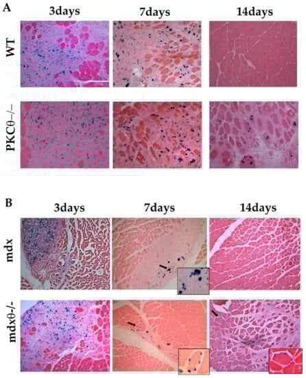 (A) Representative cryosections of TA muscle derived from WT and PKCθ−/− sacrificed 3, 7, or 14 days after transplantation (n = 3–5/genotype, each time point), as indicated, and processed for X-gal activity (bar = 100µm). (B) Representative cryosections of TA muscle derived from mdx and mdxθ−/− sacrificed 3, 7 or 14 days after transplantation, (n = 3–5/genotype, each time point), as indicated, and processed for X-gal activity. Small side pictures show higher magnification of parts of the sections. Arrows indicate X-gal positive nuclei included within some fibers in PKCθ-null mice, in both non-dystrophic and dystrophic background.