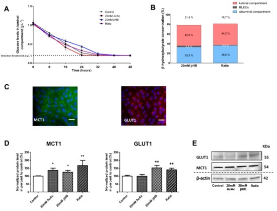 Overall, our results demonstrate that when glucose levels fall, βHB is stable and is still present in the culture medium and inside the BLECs after 48 h of treatment. In addition, the presence of KBs in the culture medium was associated with higher MCT1 and GLUT1 protein levels in BLECs, which corresponds with previous in vivo results.