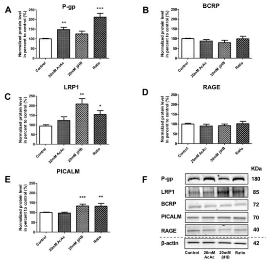 Previous reports have shown that the induction of ketosis in mouse and dog models led to reduced accumulation of Aβ within the brain [,]. However, the way in which KBs are able to decrease the Aβ burden has yet to be elucidated. For the first time, we demonstrated that KBs are able to modulate LRP-1, P-gp, and PICALM protein levels in BLECs. In particular, we showed that (i) the protein levels of P-gp were significantly increased in AcAc and in the ratio condition, (ii) LRP1 protein levels were significantly upregulated by both βHB and in the ratio condition, and. interestingly, that (iii) the PICALM protein level was induced in BLECs upon exposure to βHB and the ratio condition. Instead, the protein levels of RAGE and BCRP were not affected by the addition of KBs. These data are in line with previous studies demonstrating that nutritional factors (e.g., a cholesterol-enriched diet or oleocanthal (a phenolic secoiridoid component of extra virgin olive oil and vitamin B) exert neuroprotective effects against AD by impacting the transcription of genes coding for receptors and transporters involved in Aβ transport across the BBB [,,,].