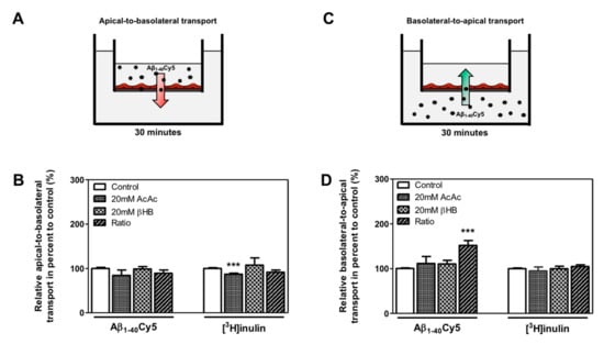 We hypothesized that KB treatment could be associated with a higher clearance of Aβ peptide through the BBB. Thus, the apical-to-basolateral (influx) and basolateral-to-apical (efflux) Aβ1–40Cy5 peptide transport across BLECs was assessed as previously described [,,]. For these experiments, we used Aβ1–40, since this is the most abundant amyloid peptide found in brain microvessels []. As a control in these experiments, the apical-to-basolateral and basolateral-to-apical transport of inulin was determined across BLECs. Inulin was used as a non-specific transport marker, as previously described [,]. As shown in Figure 4B, the apical-to-basolateral transport of the Aβ1–40Cy5 peptide was not affected by the presence of KBs. In the same way, the values for [3H]inulin transport did not differ significantly in the presence of KBs, except for the AcAc condition, where a slight decrease was observed (12.9%, p-value = 0.0005) (Figure 4B).