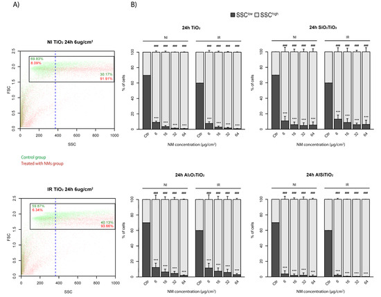 Internalization of nanomaterials (NMs) into 16HBE14o- cells. Cells are platted in 24 wells plates at 4.5 × 104 cells per well, and maintained in control conditions (Ctlr), or in the presence of 6, 16, 32 or 64 μg/cm2 of the different type of TiO2. (A) Flow cytometry are performed 24 h later, and internalization is measured by the increase of SSC for TiO2, SiO2TiO2, Al2O3TiO2 and AlSiTiO2. A threshold is defined at 70% for non-irradiated cells, and 60% for irradiated cells regarding the pattern of FSC/SSC for the control groups, and (B) the results are reported for each type of NMs. (means ± S.E.M., n = 3, *** p < 0.001 (Welch t-test), as compared to the percentage of SSClow of the control group, ### p < 0.001 (Welch t-test), as compared to the percentage of SSChigh of the control group).