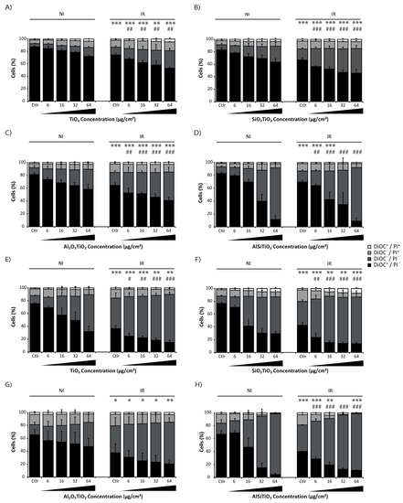 Cell death assay performed 72 h and 7 days after TiO2 treatment combined or not with 4 Gy irradiation. Human bronchial epithelial 16HBE14o- cells are maintained in control conditions (Ctlr) or treated with 6, 16, 32 or 64 μg/cm2 of (A,E) titanium dioxide (TiO2), (B,F) Silica coated titanium dioxide (SiO2TiO2), (C,G) Aluminum coated titanium dioxide (Al2O3TiO2) or (D,H) double silica and aluminum coated titanium dioxide (AlSiTiO2), and irradiated or not. Cells are maintained in culture for 72 h (A–D) or 7 days (E–H) after treatment and then co-stained for the cytofluorometric detection of cell death with DiOC6(3) and propidium iodide. Representative dot plots and quantitative data are reported (means ± S.D. n = 3, except for A) n = 2). * p < 0.05, ** p < 0.01, *** p < 0.001 (Student’s t-test), as compared with cells maintained in same conditions but non-irradiated. # p < 0.05, ## p < 0.01 and ### p < 0.001 (Student’s t-test), as compared with IR cells maintained in Ctlr condition.