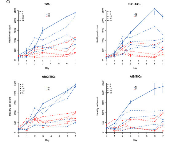 It should be noticed that the non-coated TiO2 NMs already showed a synergistic effect with the 4 Gy IR from 24 h after irradiation, with a maximal effect at 48 h (Figure 4B). SiO2TiO2 and Al2O3TiO2 NMs show a similar pattern of synergy, which was lower than the non-coated TiO2. Unexpectedly, AlSiTiO2 show a maximal synergistic effect only 72 h after irradiation.