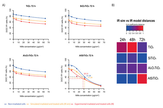 Synergy study between each type of TiO2 and 4 Gy irradiation. (A) Log-logistic model were built (i) to simulate the theoretical effect between each type of NMs and 4 Gy irradiation, and (ii) to fit the real effect obtained experimentally. The dotted lines: in the case of AlSiTiO2, the synergistic effect was detectable until around 30 µg/cm2. (B) Heat map representing a higher or lower effect of experimental toxicity of NMs combined with 4 Gy irradiation versus the theoretical toxicity for 24, 48 and 72 h after treatment.
