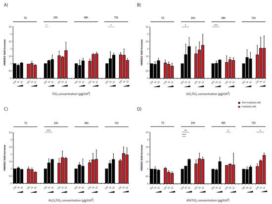 As a control of the basal level, RT-PCRs are also realized at T0, just after treatment and/or irradiation. At this time point, there was no difference in HMOX1 expression in cells compared to the non-irradiated control group. However, as expected, this expression increased when cells were just treated with TiO2 NMs in a dose-dependent way from 24 h after introduction of NMs into cells until 72 h at least.