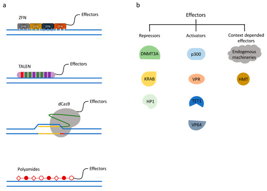 Chromatin engaging technologies and gene regulation systems. (a) Chromatin engaging technologies. ZF (zinc finger), TALE (transcription activator-like effector), dCas9, and polyamides are chromatin-engaging techniques used for precise gene targeting, often fused directly to effector proteins. (b) Gene regulation systems. Examples of different effectors used in chromatin engaging technologies. By fusing repressive or activating effectors to chromatin engaging platforms, gene regulation can be achieved.