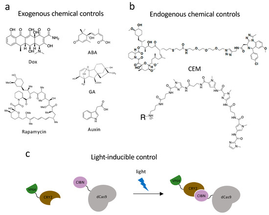 Dynamic control systems. (a) Exogenous chemical controls. Dox, rapamycin, ABA (abscisic acid), GA (gibberellic acid) and auxin can interact with DNA-binding systems to recruit effectors to chromatin and achieve dynamic chromatin regulation. (b) Endogenous chemical controls. CEMs and Syn-TEFs are synthetic molecules designed to facilitate with chromatin engaging constructs and achieve precise gene regulation by recruiting endogenous protein complexes. (c) Light-inducible control technology. Light-inducible heterodimerizing proteins, CRY2 and CIBN, undergo a conformational change in the presence of a specific fluorescent light and bring effectors to chromatin engaging constructs to regulate gene transcriptions.