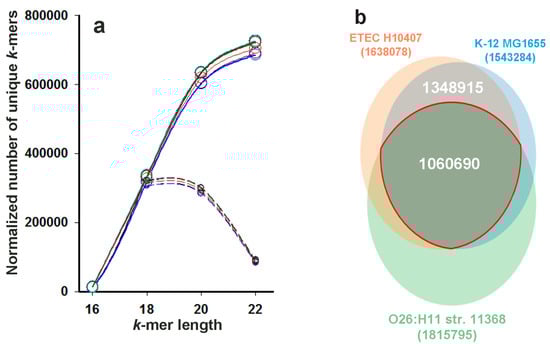 The size of the “unique genomes” represented by k-mers of different length for eight individual E. coli chromosomes, and the degree of their intersection exemplified by three indicated genomes. (a) The solid lines show the normalized per 1 Mbp in each genome number of k-mers (N), found in the chromosomes of E. coli (strains: K-12 MG1655, ETEC H10407, O26:H11 str. 11368, ABU 83972, APEC O78, str. 042, O157:H7 str. EC4115 and O7:K1 str. CE10) that are absent in the nucleotide sequences of the reference database. Dashed lines show the increment curves plotted for ΔN/Δk. (b) Venn diagram illustrating the intersection between the sets of 18-mers identified in the genomes of two bacteria from group A (E. coli K-12 MG1655 and ETEC H10407) and the E. coli O26:H11 str. 11368, belonging to group B1. The number of unique 18-mers in each genome, the size of their common set and the intersection between the two sets of group A are indicated without normalization. The diagram was created using a Venn Diagram Maker [54].