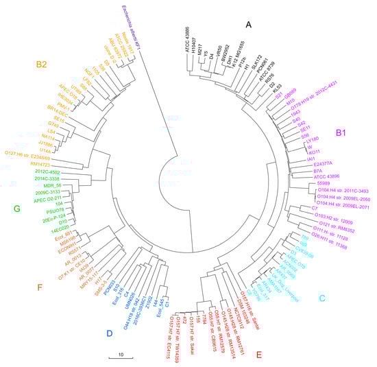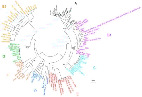 The sequences of the 27 discriminatory genes listed in Supplementary Table S1 were used to obtain a phylogenetic tree based on classical multilocus typing. Thirteen of them encode enzymes of metabolic pathways (aes, icd, pabB, trpA, trpB, fumC, mdh, purA, aspC, fadD, uidA, aroE, mtlD); ten belong to replication, repair, or transcription systems (polB, gyrA, recA, dinB, dnaG, mutS, arcA, cyaA, grpE, rpoS), and the remaining four control the production of two symporters (putP, lysP), kinase (adk) and protease (clpX). The sequences of these genes were obtained from 124 E. coli genomes (listed in Supplementary Table S1), including 59 complete genomes, whose phylogroups were previously identified in original papers [45,52,55,56,57,58,59,60,61,62,63,64,65,66,67,68,69] (shown in bold in Supplementary Table S1). The remaining 65 genomes unassigned to phylogroups and containing orthologs of discriminatory genes were added to increase the resolution of phylogenetic trees.