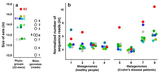Phylogroup-dependent taxonomy of metagenomes from four healthy individuals (numbers 1–4) and four patients with Crohn’s disease (numbers 5–8). Panel (a) shows the size distribution for cumulative sets of unique 22-mers (colored symbols) and selected metagenomes numbered in the same way as in panel “b” (open symbols). Panel (b) demonstrates the number of sequence reads assigned to a particular group, normalized by the size of cumulative sets of 22-mers (Table 1) and the number of reads in metagenomes. Numerical values in both cases are presented as their natural logarithms.