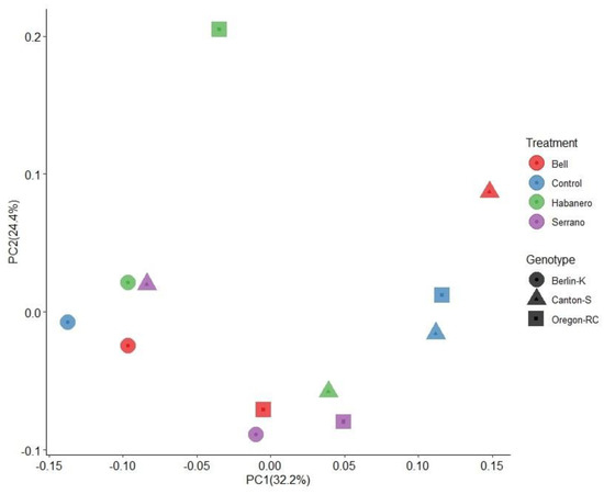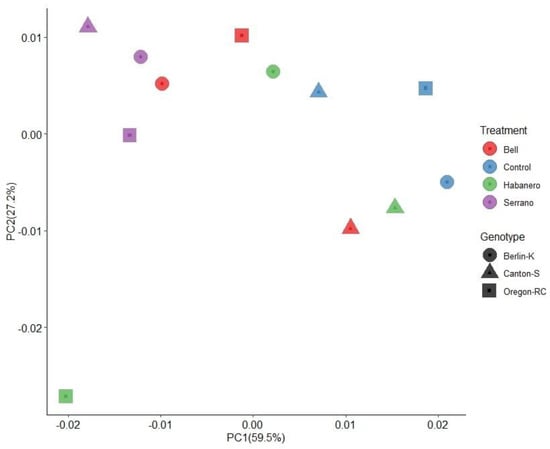 Pairwise comparisons of unweighted UniFrac distances revealed significantly different gut microbiomes between Berlin-K and Canton-S (p = 0.003). Additionally, gut microbial communities of Oregon-RC statistically differed from those of Berlin-K (p = 0.01) (Table S4). However, when the abundance of ASVs was considered (weighted UniFrac distance), the diets appeared to influence the microbiome structure of the Drosophila genetic backgrounds (PERMANOVA, p < 0.01, 1000 permutations) (Table S5). Additionally, the PCoA plot for this distance explained a greater amount of variation (89.2% of overall diversity; Figure 2). Pairwise comparisons revealed that microbial communities in Drosophila genetic backgrounds reared on the serrano-containing diet significantly differ from those detected in the control diet (p = 0.042; Table S6).