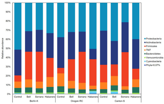 Proteobacteria represented more than 50% of the microbiome in Berlin-K flies reared on the control diet, although this phylum was found in less abundance in flies raised on pepper-containing diets (29.78–33.37%). In contrast, Firmicutes was found in much greater abundance in these gut microbiomes (21–32.79%) as compared with microbial populations of flies maintained on control diet (6.72%). This phenomenon was also observed in gut microbial communities of Oregon-RC flies, where Firmicutes abundance increased from 6.06% in flies with the control diet to 23.55 to 34.04% in flies with pepper-containing diets. Conversely, Actinobacteria proportion decreased from 33.58% with the control diet to 22.05 and 11.36% with serrano- and habanero-containing diets, respectively.