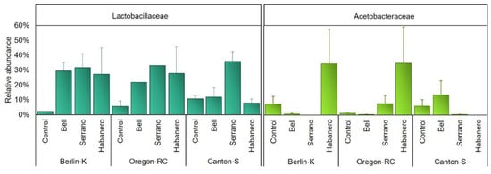 In this study, the microbiome at the family level showed Lactobacillaceae (30.11%) and Acetobacteraceae (10.67%) among the most abundant families across pepper-containing diets (Figure S2). Berlin-K and Oregon-RC flies reared on habanero-containing diets showed a high abundance of both microbial groups. In addition, Lactobacillaceae was found in greater abundance in Berlin-K and Oregon-RC flies raised on all pepper-containing diets as compared with flies maintained on the control diet (Figure 4). Lactobacillaceae was dominated by genera within the order Lactobacillales (Pediococcus and Lactobacillus). Lactobacillus was mainly represented by Lactobacillus brevis (Figure S3). L. brevis was greatly abundant in Berlin-K flies reared on bell pepper-containing diet, whereas in Oregon-RC flies, L. brevis abundance was 4-fold higher in flies reared on pepper-containing diets than on the control diet.
