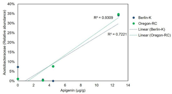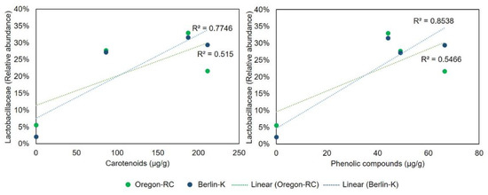 The effect of the pepper-containing diets on the Lactobacillaceae and Acetobacteraceae abundance was supported by the regression analysis presented in Figure 5 and Figure 6. These graphs show the correlation between Lactobacillaceae and Acetobacteraceae abundances and the concentration of various compounds. Lactobacillaceae abundance in Berlin-K and Oregon-RC flies was positively correlated to the content of phenolic compounds and carotenoids. As these compounds increased in the pepper diets, the abundance of Lactobacillaceae was also found to be augmented. Furthermore, Acetobacteraceae abundance showed a positive correlation with the concentration of the phenolic compound apigenin in these two genetic backgrounds (Figure 6). As habanero peppers contained a considerable concentration of apigenin (Table 1), the great abundance of Acetobacteraceae in Berlin-K and Oregon-RC flies reared on habanero-containing diets may be attributed to this compound.