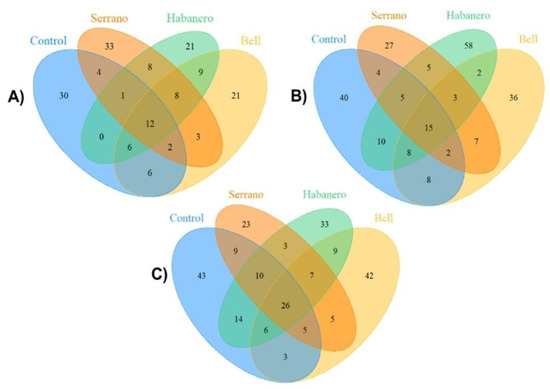 The core microbiome in the different genetic backgrounds is represented in Figure 7. In Berlin-K flies, 12 ASVs were consistently present with all diets. They belonged mainly to Alphaproteobacteria, Bacteroidetes, and Actinomycetales classes, but 15 ASVs belonging to Actinobacteria, Alphaproteobacteria, Gammaproteobacteria, and Flavobacteria were common in Oregon-RC flies under all diets. In addition, 26 ASVs belonging to Actinobacteria, Alphaproteobacteria, Bacilli, and Flavobacteria were present in Canton-S flies. Moreover, their abundance strikes as being mediated by the dietary pepper treatments.