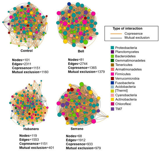 Networks of the Oregon-RC genotype fed with pepper diets showed Rhizobiales, Actinomycetales, and Pseudomonadales were not hubs of these networks as they were in control diets, indicating the pepper diets caused a perceptible shift in networking (Figure 8). Furthermore, network structure was altered under different pepper-containing diets, serrano and bell peppers being the main shapers of the microbial community.