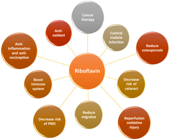 Riboflavin (RF) is a water-soluble member of the B-vitamin family. Sufficient dietary and supplemental RF intake appears to have a protective effect on various medical conditions such as sepsis, ischemia etc., while it also contributes to the reduction in the risk of some forms of cancer in humans. These biological effects of RF have been widely studied for their anti-oxidant, anti-aging, anti-inflammatory, anti-nociceptive and anti-cancer properties. Moreover, the combination of RF and other compounds or drugs can have a wide variety of effects and protective properties, and diminish the toxic effect of drugs in several treatments. Research has been done in order to review the latest findings about the link between RF and different clinical aberrations. Since further studies have been published in this field, it is appropriate to consider a re-evaluation of the importance of RF in terms of its beneficial properties.