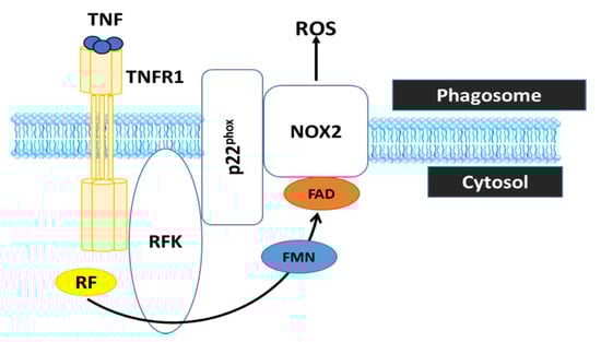 RF, the precursor of FAD and FMN, is converted by riboflavin kinase (RFK) into FMN and FAD, which are essential cofactors of the phagocytic nicotinamide adenine dinucleotide phosphate (NADPH) oxidase 2 (Nox2). In particular, it has been shown that RF deficiency using conditional RFK knockout strains of mice impairs Nox2 priming. Such an effect may have implications for ROS production which impairs defence against Listeria monocytogene [51]. These data show that TNF priming of Nox2 represents a RF-dependent mechanism that is crucial for optimal ROS production in innate immune responses (Figure 4).