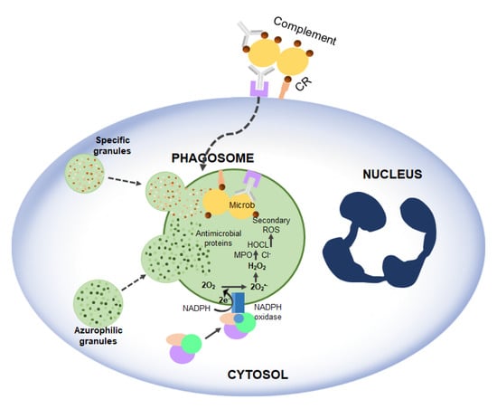 Activation of NADPH oxidase and microbicidal systems during phagocytosis. Complement and antibody receptors (CRs and FcRs) promote the uptake of micro-organisms by neutrophils, which, in turn, trigger the degranulation and production of ROS.