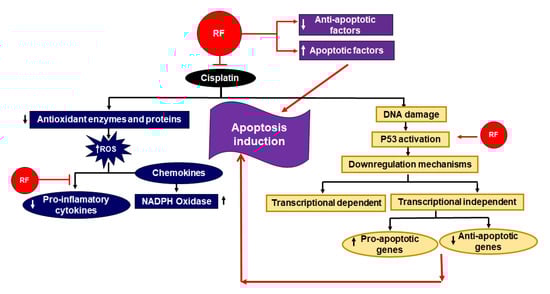 Role of RF as an adjuvant in cisplatin based chemo radiotherapy [75]. RF stimulates apoptotic factors and downregulates anti-apoptotic factors. Additionally, it activates p53, which also results in an amplification of apoptosis. The inhibitory effects of RF in respect to the deteriorate effect of cisplatin are also shown. On the one hand, it inhibits the downregulation of antioxidant enzymes and proteins; on the other, RF downregulates pro-inflammatory cytokines.