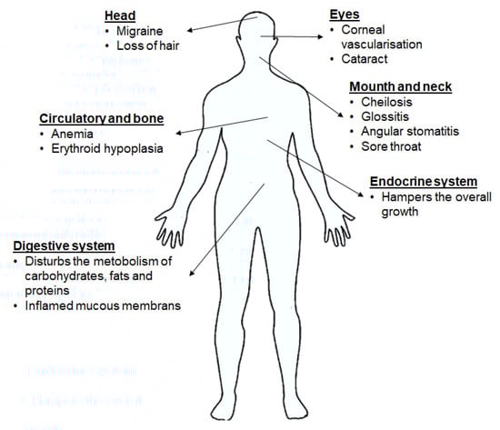 Ariboflavinosis in humans causes various symptoms like sore throat, hyperaemia, oedema of the oral and mucous membranes, cheilitis and glossitis, hair loss, inflammation of skin, cataract development, migraine and a decrease in Hb. RF deficiency has shown an influence on the iron absorption, metabolism of tryptophan, mitochondrial function, brain and the metabolism of other vitamins. The Food and Nutrition Board 1998 published that a balanced diet meets the recommended intake of 1.4 mg RF per day for an adult man. A study observed that approximately 60% of elderly people were at risk for RF deficiency [97]. The shortage of RF could also be a consequence of the use of some drugs, alcohol consumption, increased need of RF due to physiological conditions like pregnancy or breastfeeding or childhood etc. (Figure 7) [7,75,88].