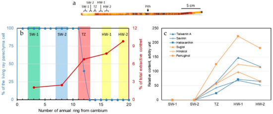 - Chen, S.Y.; Yen, P.L.; Chang, T.C.; Chang, S.T.; Huang, S.K.; Yeh, T.F. Distribution of living ray parenchyma cells and major bioactive compounds during the heartwood formation of Taiwania cryptomerioides Hayata. J. Wood Chem. Technol. 2018, 38, 84–95. [Google Scholar] [CrossRef]
