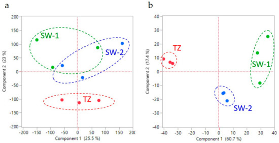 Principle component analysis of the normalized gene expression level (reads per kilobase per million mapped reads) using (a) longest unigenes, and (b) differentially expressed genes. SW-1, outer sapwood; SW-2, inner sapwood; TZ, transition zone.