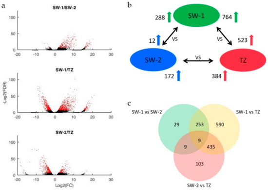 DEGs log2 (fold change) > 1; FDR p-value < 0.005) between any two different tissues of the HW formation process. (a) Volcano plots between two tissues, DEGs in red dots; (b) The numbers of significantly up-regulated genes between any two tissues (double-headed arrows); (c) Common and unique DEGs between any comparison groups represented in Venn diagram. SW-1, outer sapwood; SW-2, inner sapwood; TZ, transition zone, DEG, differentially expressed gene; FDR, false discovery rate.