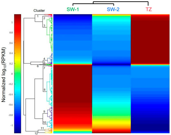 Hierarchical cluster analysis of the 1428 DEGs with differential expression across three different tissues. SW-1, outer sapwood; SW-2, inner sapwood; TZ, transition zone. The log10 (RPKM) value of the same DEG was normalized between 1 and -1 within three tissues. RPKM, reads per kilobase per million mapped reads.