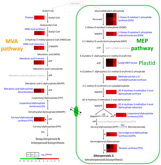 - Vranová, E.; Coman, D.; Gruissem, W. Network analysis of the MVA and MEP pathways for isoprenoid synthesis. Annu. Rev. Plant Biol. 2013, 64, 665–700. [Google Scholar] [CrossRef]